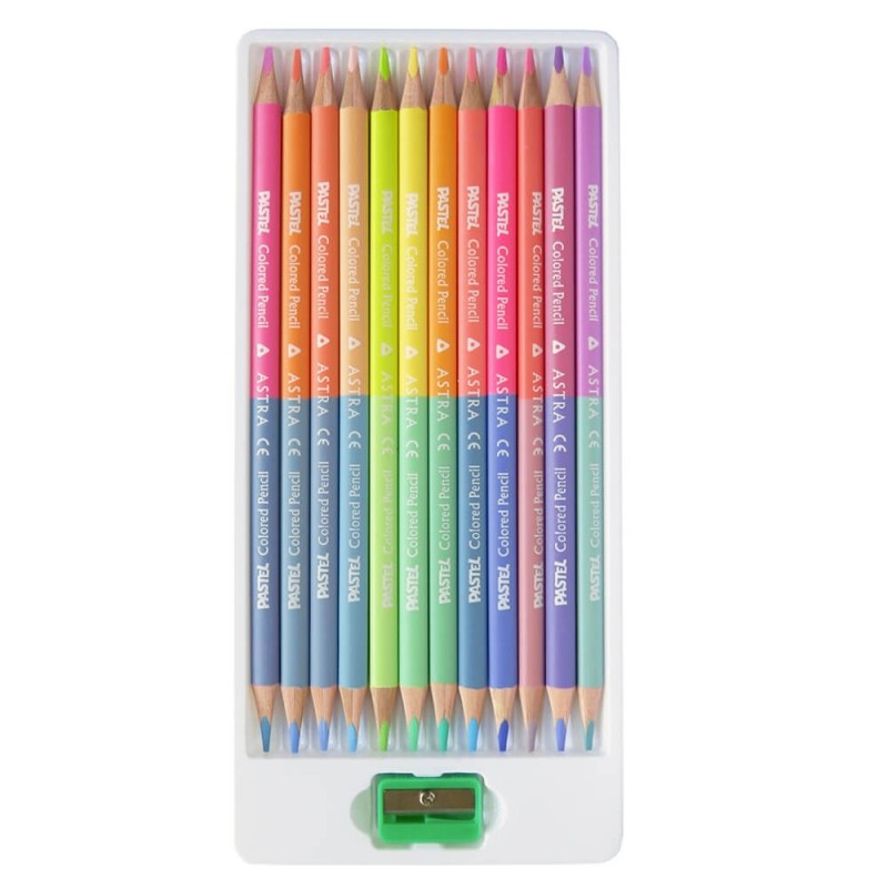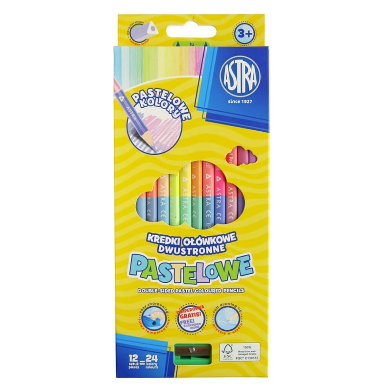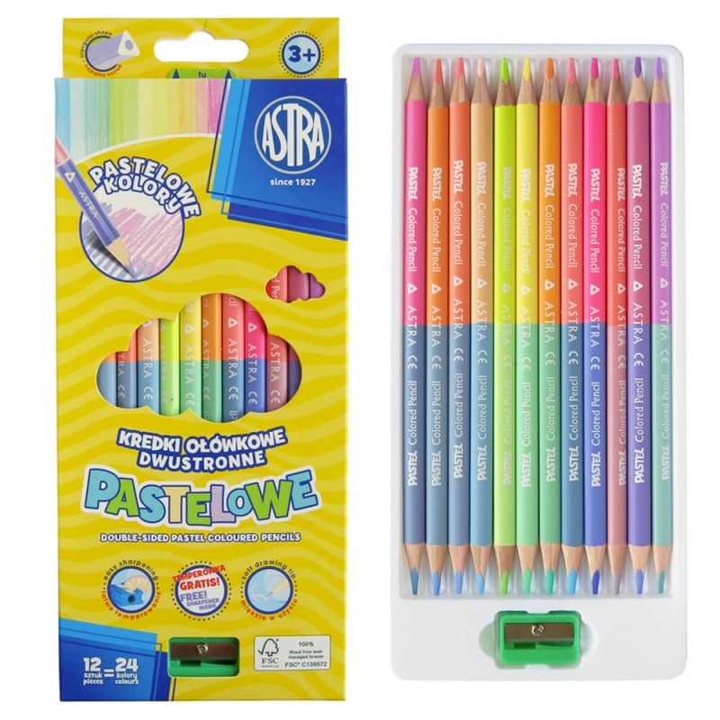 ASTRA - Zestaw Kredek z Temperówką - Kredki Ołówkowe Dwustronne - PASTELOWE - 24 Kolory - 3713