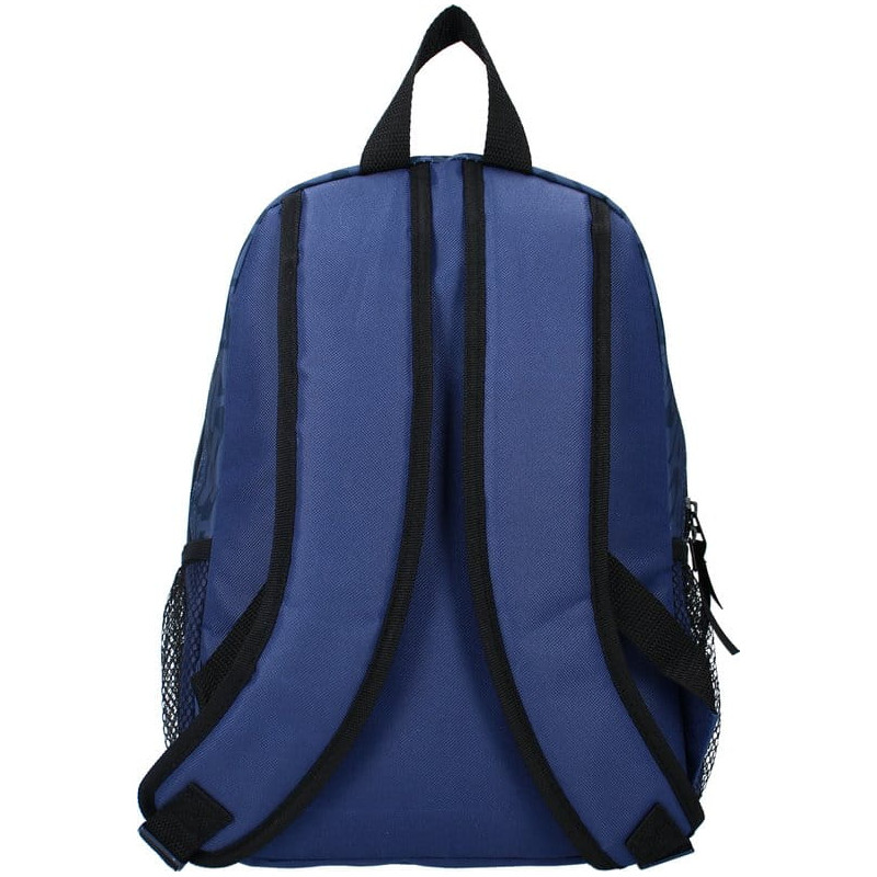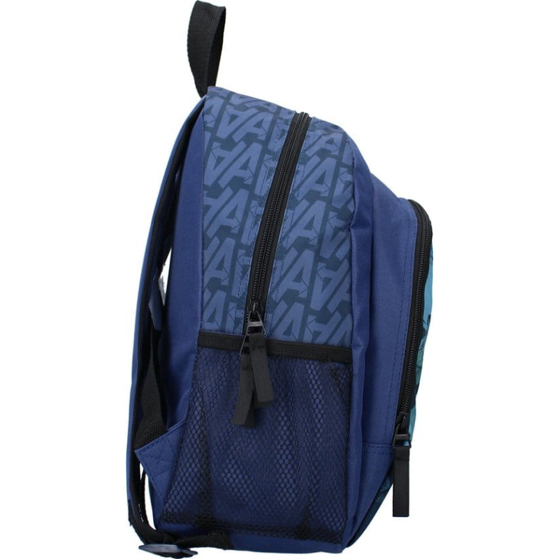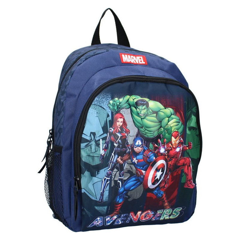 Plecaczek dla wszystkich fanów serii bohaterów Avengers! Plecak jest ciemno-granatowego koloru, a na przedniej kieszeni umieszczono grafikę superbohaterów serii Avengers. Po bokach plecak posiada dwie mniejsze kieszeni z siatki, które pomieszczą podłużne przedmioty. Plecak ma usztywniane plecy i regulowane szelki, jakie można dopasować do gabarytów dziecka.