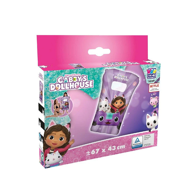 Dmuchany materac z uwielbianą bohaterką bajki dla dzieci - Koci domek Gabi, sprawi radość podczas wodnych zabaw! Wymiary materaca po nadmuchaniu to ok. 67 cm długości i ok. 43 cm szerokości. Materac posiada zgłębienie na głowę, jest fioletowego koloru, a w centralnej części materaca znajduje się grafika Gabi, jadącej w samochodzie z Pandusiem.